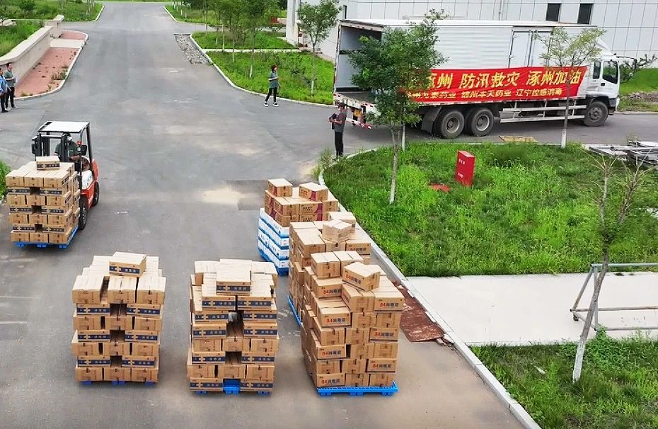 8月5日到7日,錦州九泰藥業及集團下屬錦州本天藥業、遼寧控感消毒科技公司三家企業上下聯動,全力組織員工從三家企業庫房緊急調配包括復方氯己定撒粉、復方紫荊皮水楊酸溶液、硫酸慶大霉素碳酸鉍膠囊、蒲地藍消炎片、對乙酰氨基酚片、氨咖黃敏膠囊、乙醇消毒液、84消毒液、碘伏消毒液及消毒片等價值300多萬元的急需藥品及消毒用品。其中消毒消殺用品因庫存不足,企業臨時決定增加生產計劃,員工加班加點24小時連續生產,爭分奪秒,將1400余件的救援藥品馳援涿州、五常、舒蘭等地,用于災區救援,保障受災群眾人身安全,助力災后重建及復工復產等工作。
